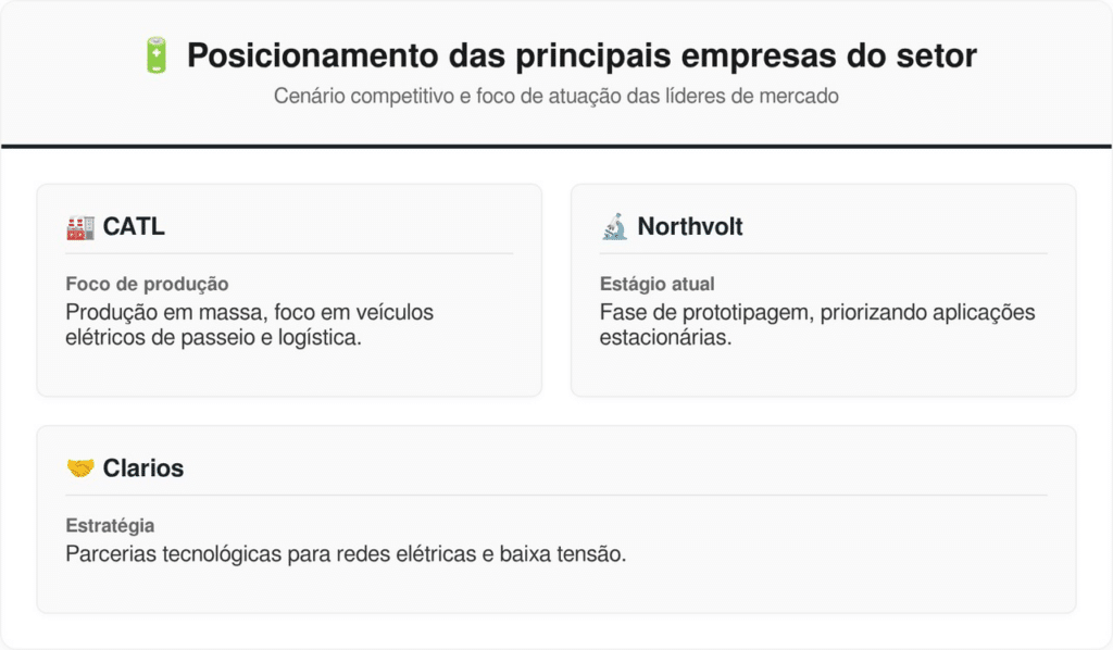 Na Europa, empresas como a sueca Northvolt desenvolvem protótipos focados em uso rural e industrial, enquanto a norte-americana Clarios mira sistemas de baixa tensão e redes elétricas. Para facilitar a compreensão desse cenário competitivo, vale observar o posicionamento das principais empresas envolvidas: