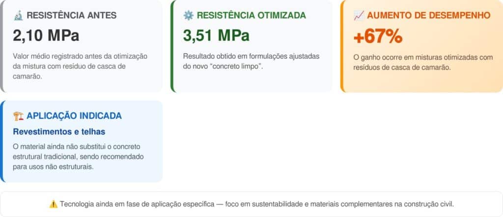 Os testes laboratoriais mostraram que a resistência à compressão do material cresceu significativamente. O desempenho passou de cerca de 2,10 MPa para até 3,51 MPa, dependendo da formulação. Veja os detalhes: