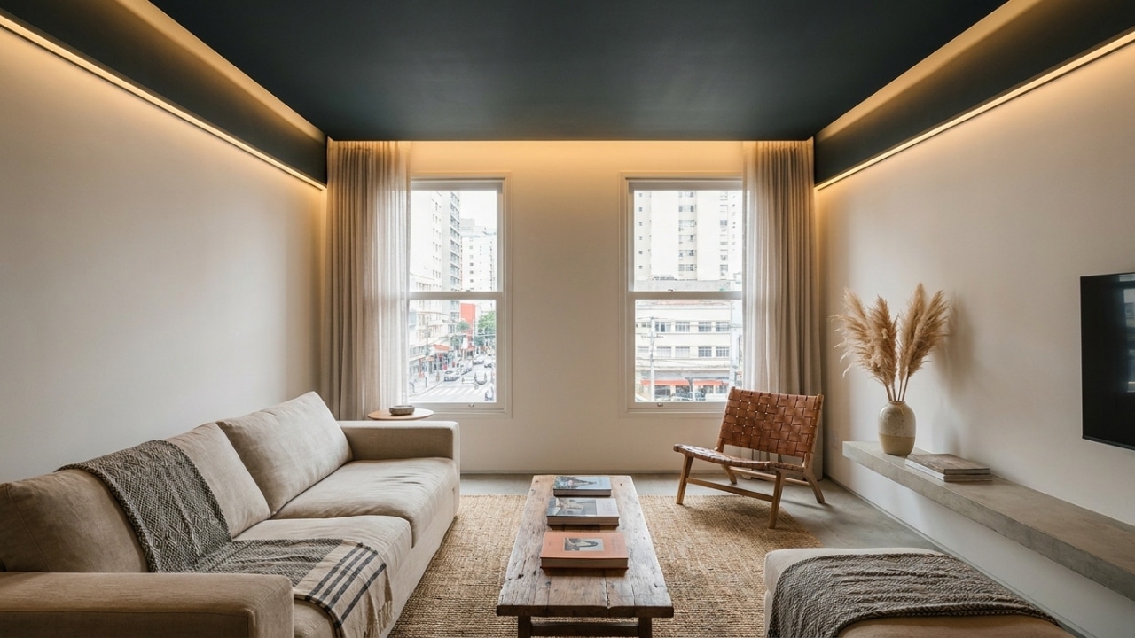 Pé-direito baixo e teto escuro parece receita para ambiente pequeno e sufocante. Mas é exatamente o contrário. Designers de interiores usam essa combinação para criar profundidade, sofisticação e a sensação de que o espaço cresceu sem mexer em uma parede sequer.