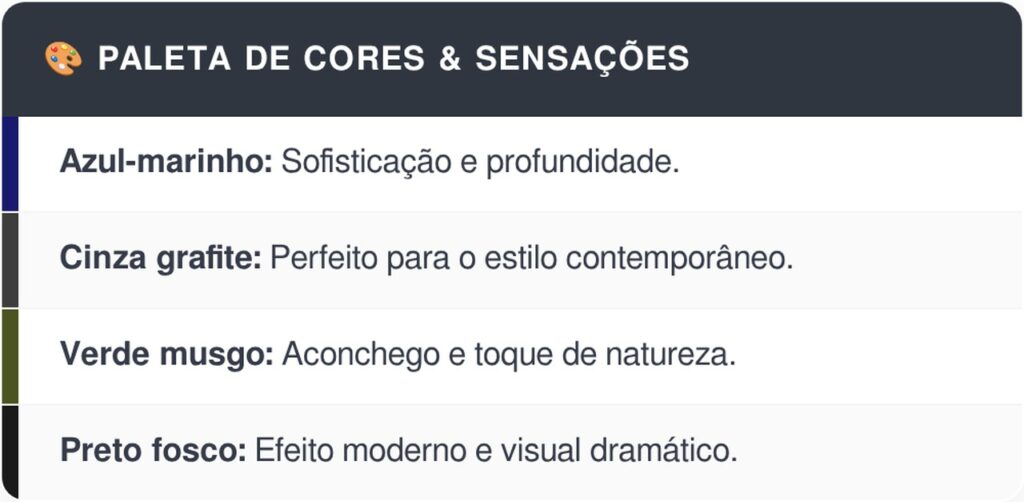 A escolha da paleta cromática é fundamental para alcançar o efeito desejado. Tons escuros precisam dialogar com iluminação e elementos decorativos para manter harmonia no ambiente.