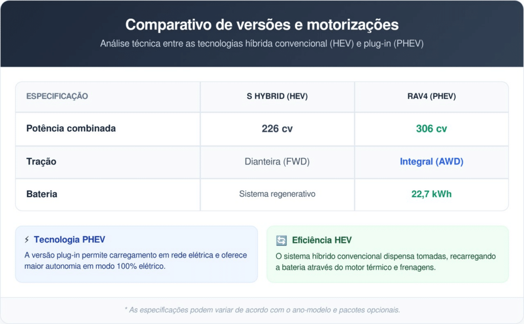 A grande estrela da linha Toyota é a variante PHEV, um híbrido plug-in que combina o motor a combustão com um sistema elétrico robusto para gerar 306 cv. Esse modelo acelera de 0 a 100 km/h em apenas 6 segundos, destacando-se pela agilidade nas estradas.