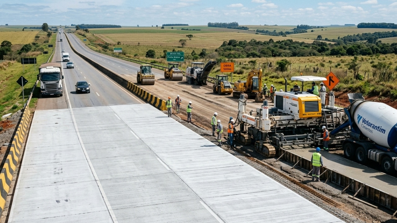 O principal sistema adotado na obra é o whitetopping, técnica em que o pavimento asfáltico existente é recuperado e aproveitado como base para receber uma nova camada de concreto. Esse modelo chama atenção porque reforça a estrutura da rodovia sem desperdiçar completamente a base já presente no trecho.