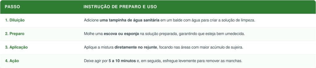 O segredo está na diluição de um produto de limpeza potente em água, criando uma solução eficaz e econômica para clarear o rejunte.