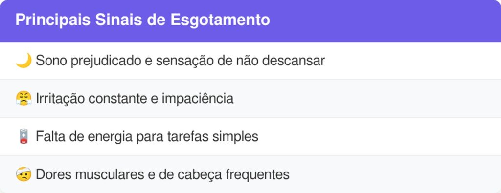 O corpo manifesta o esgotamento por meio de sinais físicos e emocionais que persistem mesmo após o descanso. Reconhecer esses sinais é essencial para evitar agravamentos. Entre os principais sinais estão: