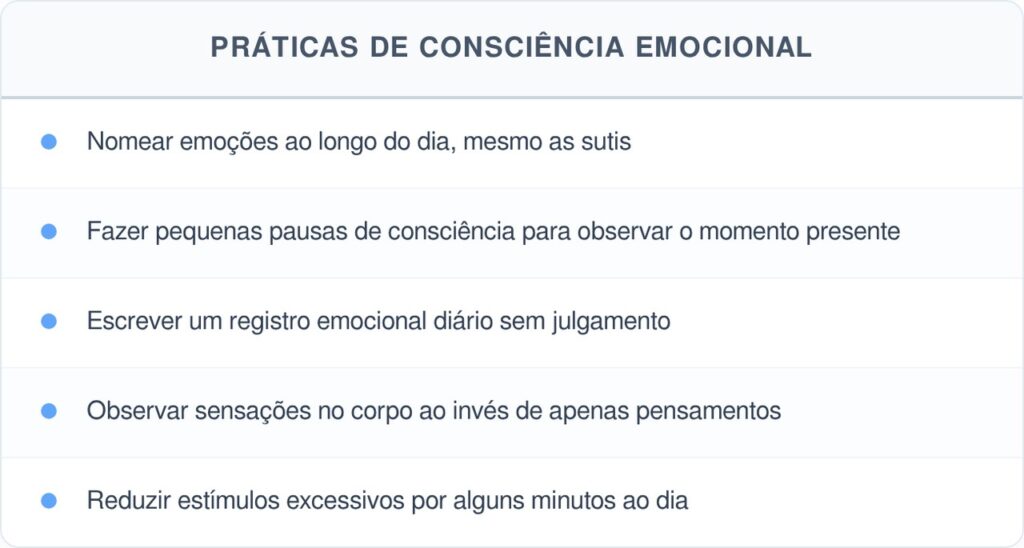 Veja abaixo algumas práticas de consciência emocional para serem aplicadas no dia a dia: