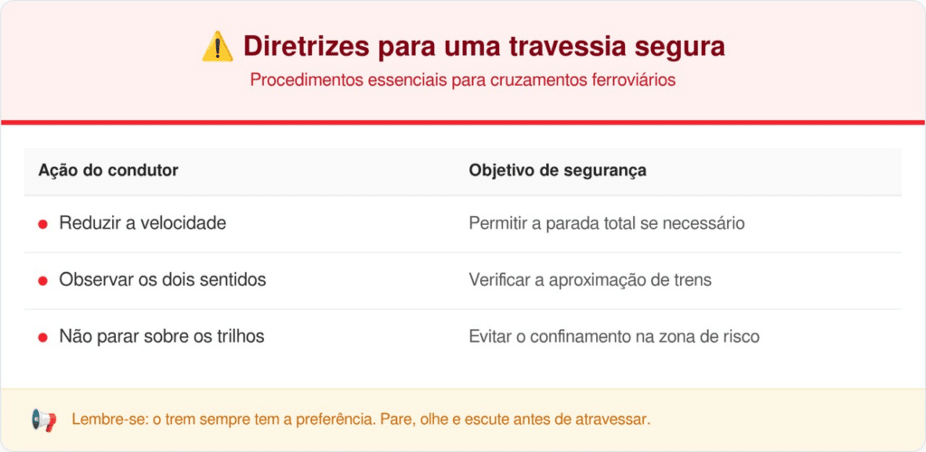 Essa placa de trânsito exige que o motorista reduza a velocidade e prepare-se para uma parada eventual. O objetivo principal é evitar colisões em áreas onde a prioridade de passagem é sempre da composição ferroviária, devido ao seu grande peso e longa distância de frenagem.