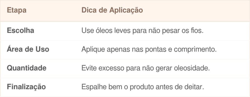Aplicar pequenas quantidades de óleo é uma técnica eficiente dentro dos cuidados capilares. O produto cria uma barreira protetora que reduz a perda de água durante a noite. Com apenas 1 a 2 gotas de óleo leve, é possível selar as cutículas, diminuir o frizz e evitar o cabelo armado. Esse cuidado simples melhora a textura e o aspecto dos fios ao acordar.