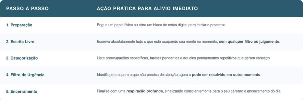 Uma forma eficaz de reduzir a sobrecarga cognitiva é o brain dump emocional, uma técnica simples que ajuda a organizar pensamentos e aliviar o excesso mental acumulado ao longo do dia. Veja abaixo como aplicar as técnicas de descarregar a mente: